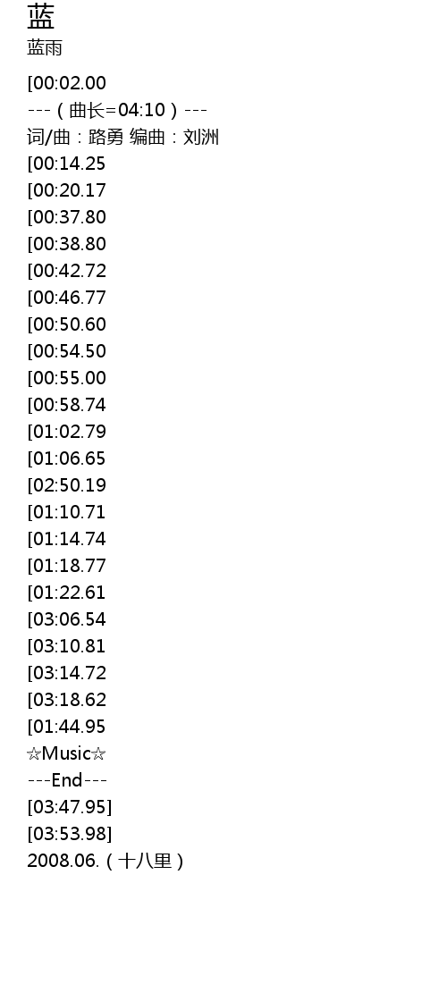 | [01:48.95][00:02.00] | 《 蓝 》 - 蓝雨 |