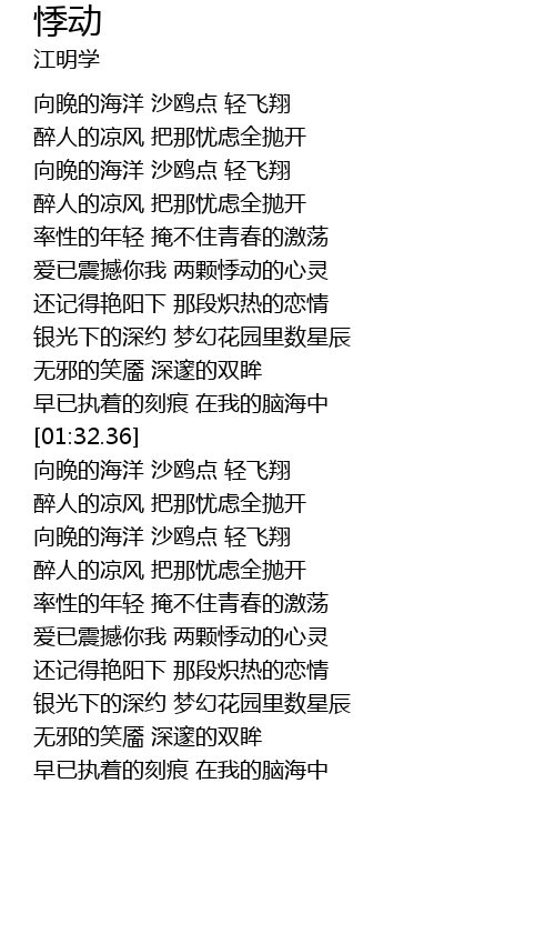 | [00:35.99] | 向晚的海洋 沙鸥点 轻飞翔 |
