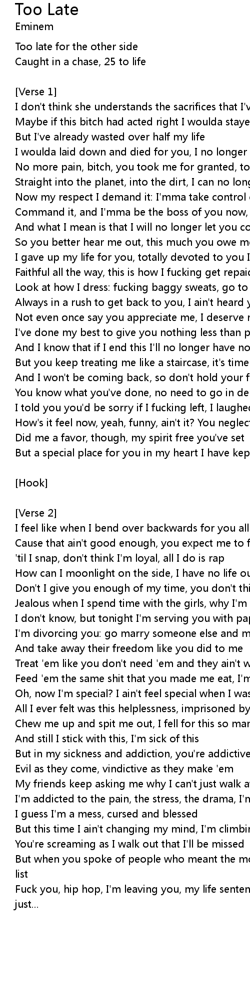 Fuck you, hip hop, I'm leaving you, my life sentence is served, bitch and it's just... |