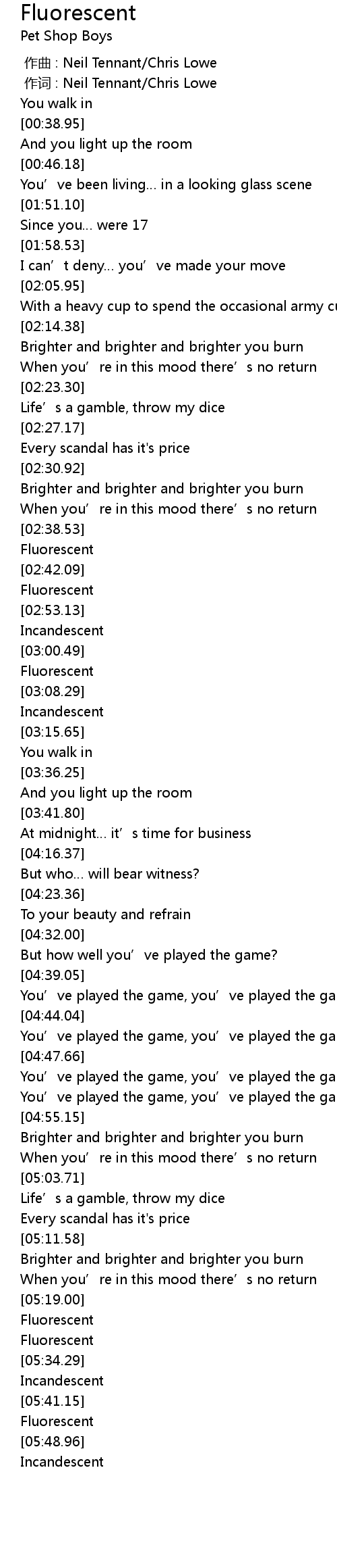 | [00:01.00] | 作词 : Neil Tennant/Chris Lowe |
