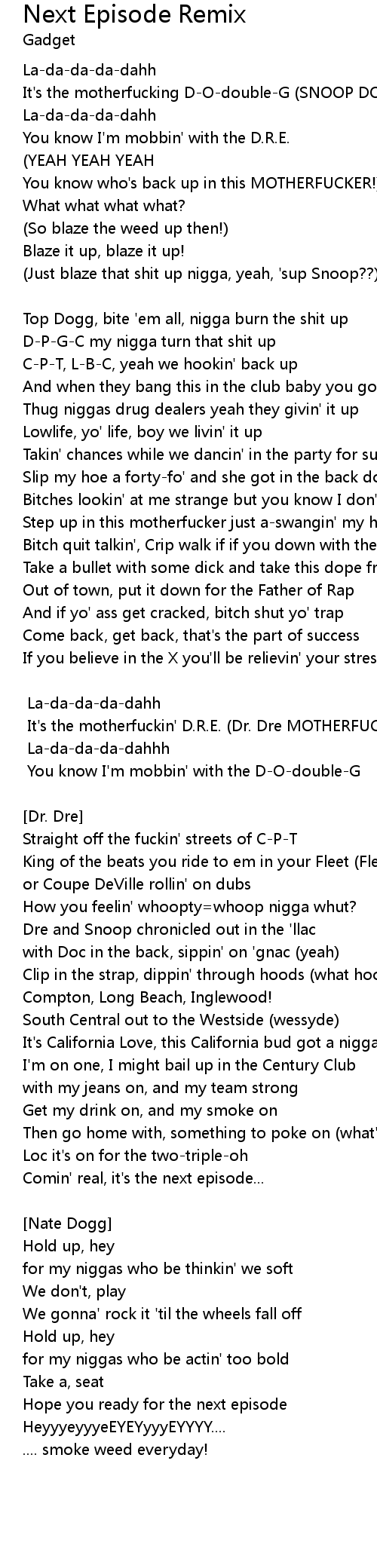 [Dre] It's the motherfuckin' D.R.E. (Dr. Dre MOTHERFUCKER!) |
