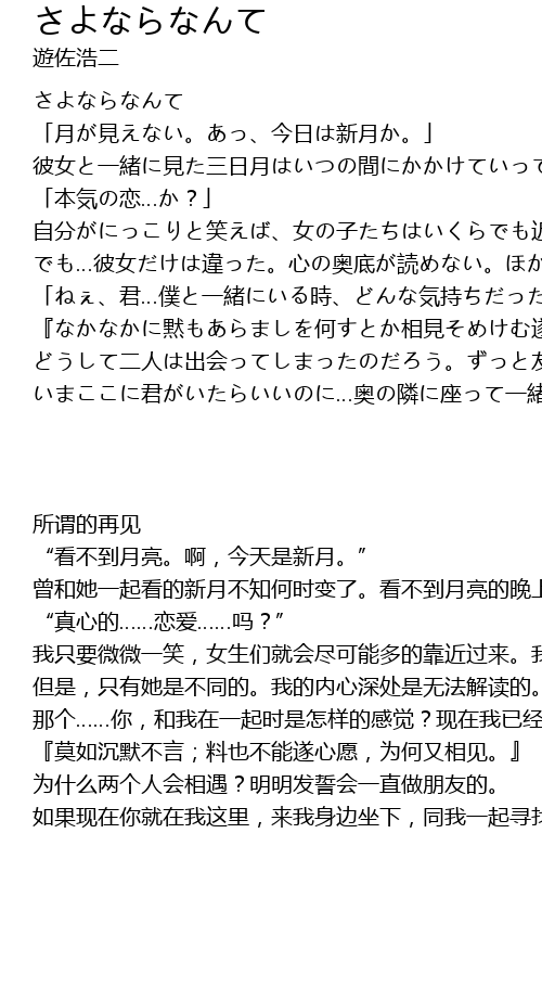 | [00:08.22] | 彼女と一緒に見た三日月はいつの間にかかけていってしまったらしい。月が見えない夜は、なんでこんなに暗いんだろう。 |