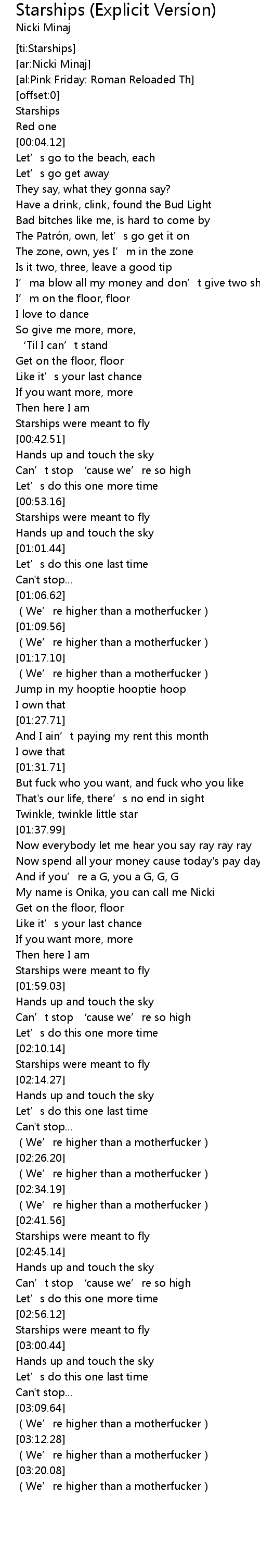 | [03:25.76] | (We’re higher than a motherfucker) |
