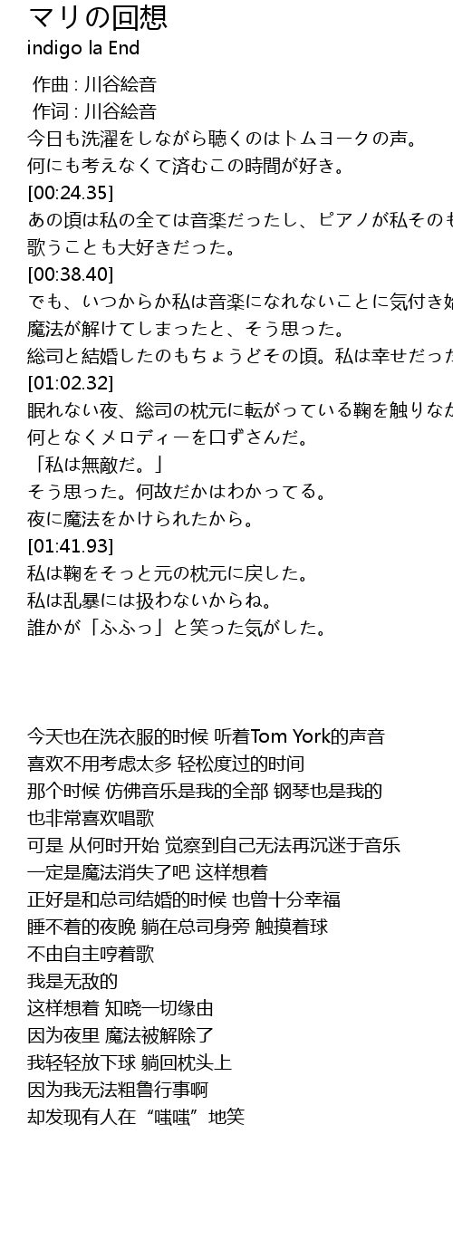 | [00:14.61] | 今天也在洗衣服的时候 听着Tom York的声音 |
