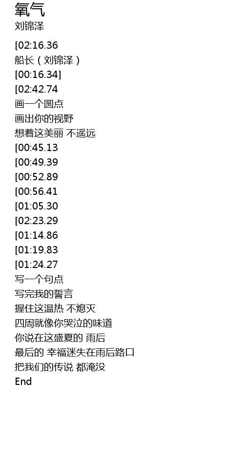 | [02:44.66][02:16.36][01:02.22][00:-0.50] | 氧气 |