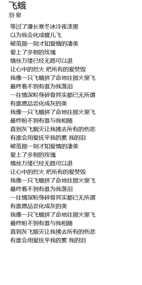 | [01:38.000] | 我像一只飞蛾拼了命地往那火里飞 |