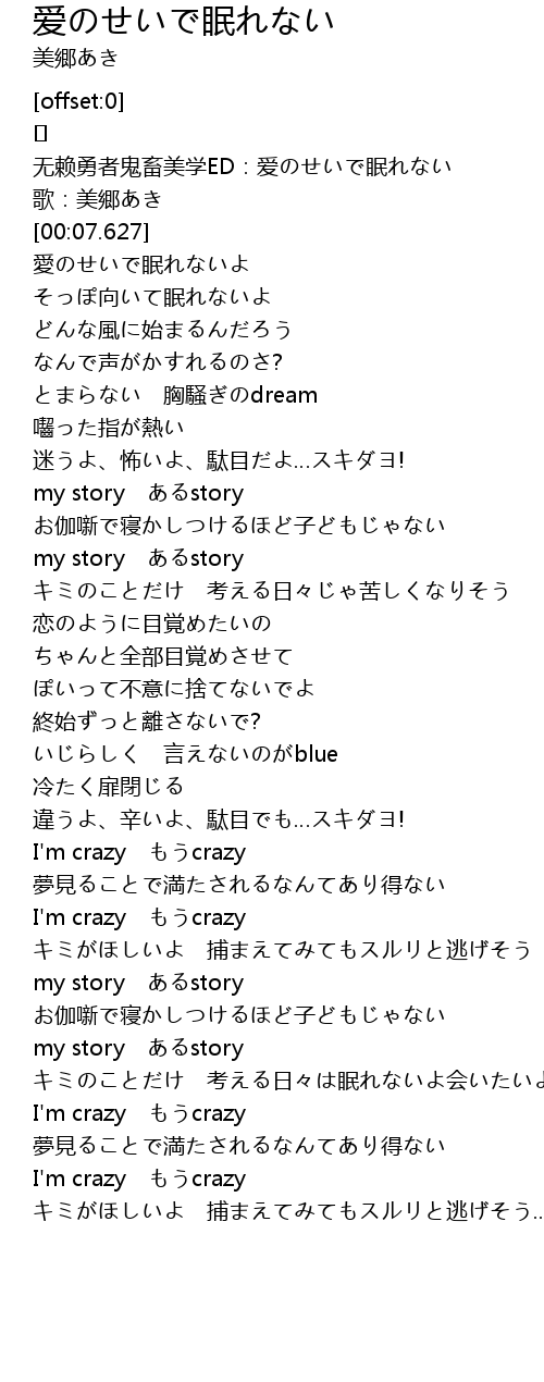 | [03:19.609] | キミのことだけ 考える日々は眠れないよ会いたいよ |