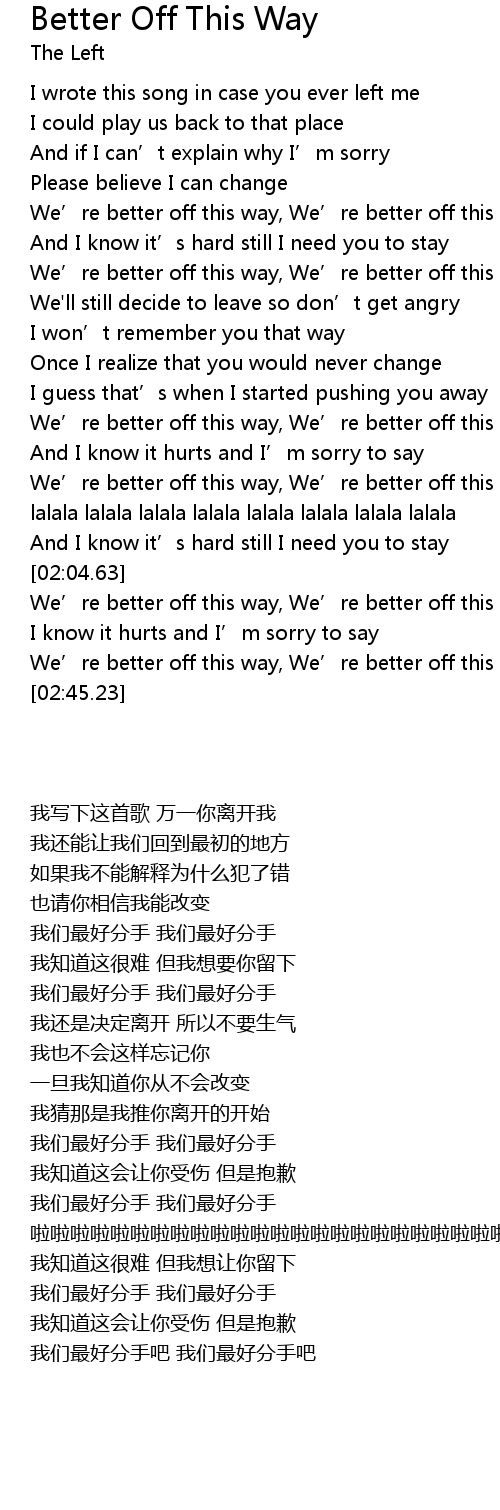 | [00:41.57] | We' re better off this way, We' re better off this way |