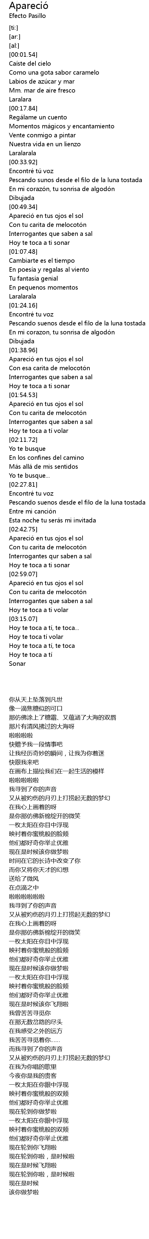 | [00:41.87] | En mi corazó n, tu sonrisa de algodó n |