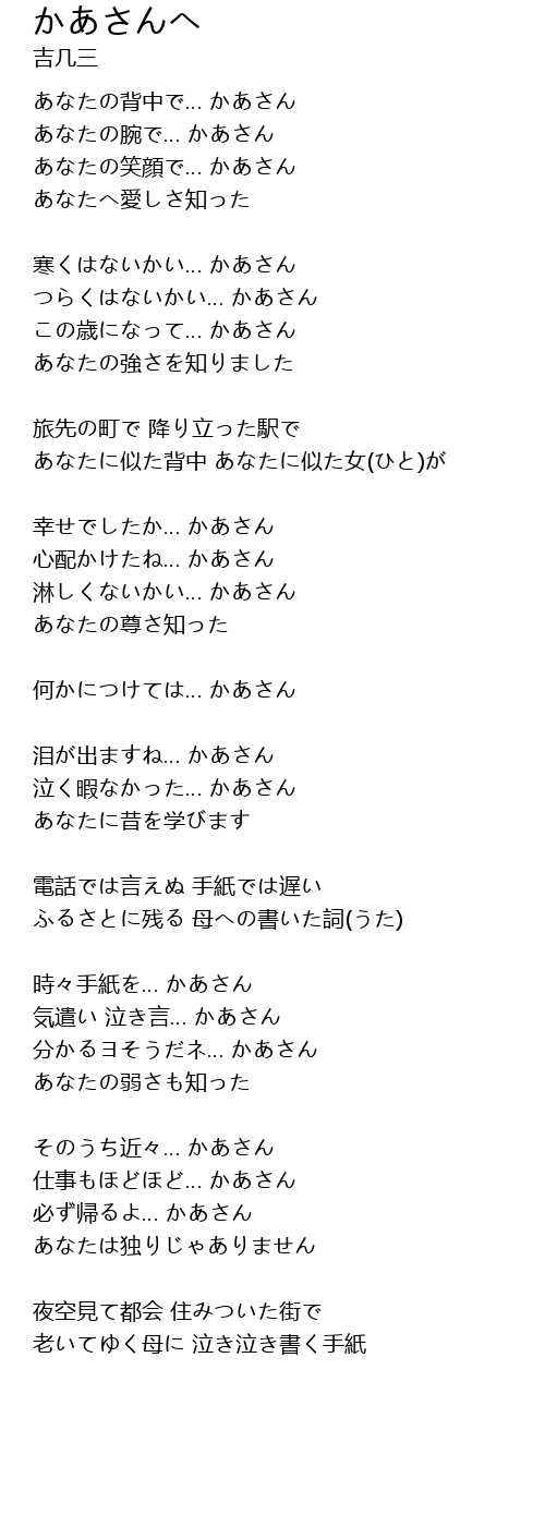 | 老いてゆく母に 泣き泣き書く手紙 |