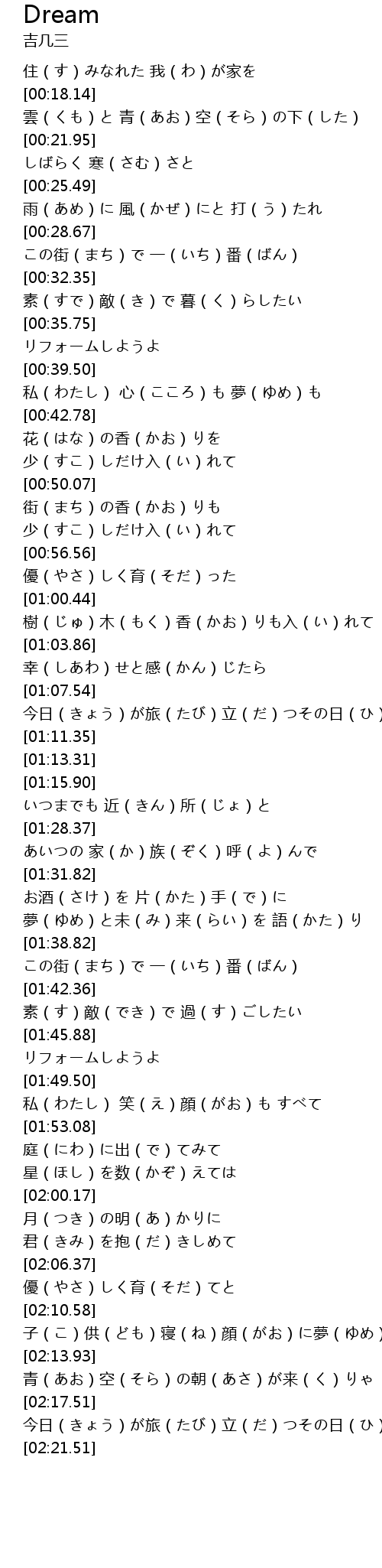 | [02:11.11] | 子(こ)供(ども)寝(ね)顔(がお)に夢(ゆめ)を |