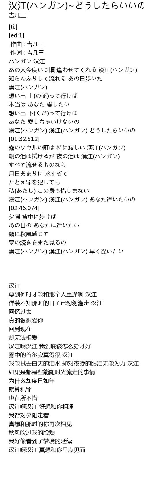 | [00:40.106] | 知らんふりして流れる あの日歩いた 漢江(ハンガン) |