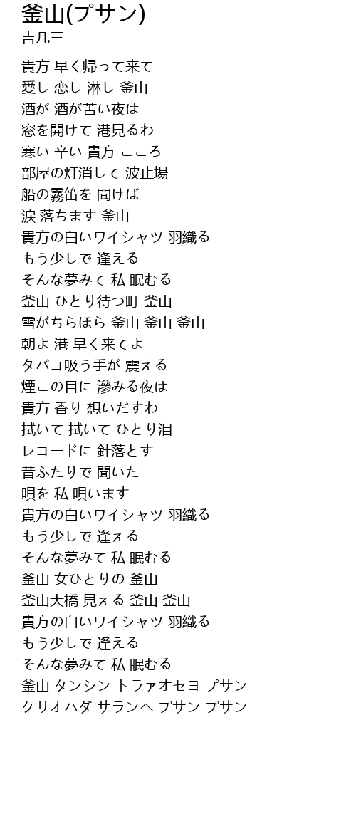 | [00:31.20] | 愛し 恋し 淋し 釜山 |
