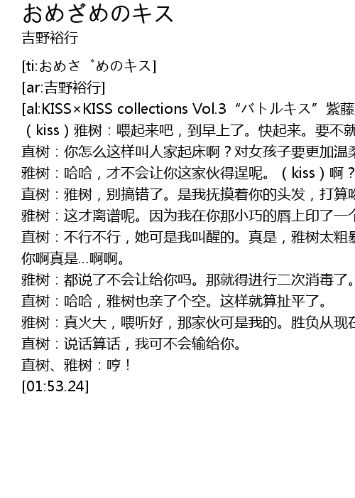 | [00:50.18] | 雅树:这才离谱呢。因为我在你那小巧的唇上印了一个火热的吻才把你惊醒了。呃?想要更多的吻?那好,(kiss) |