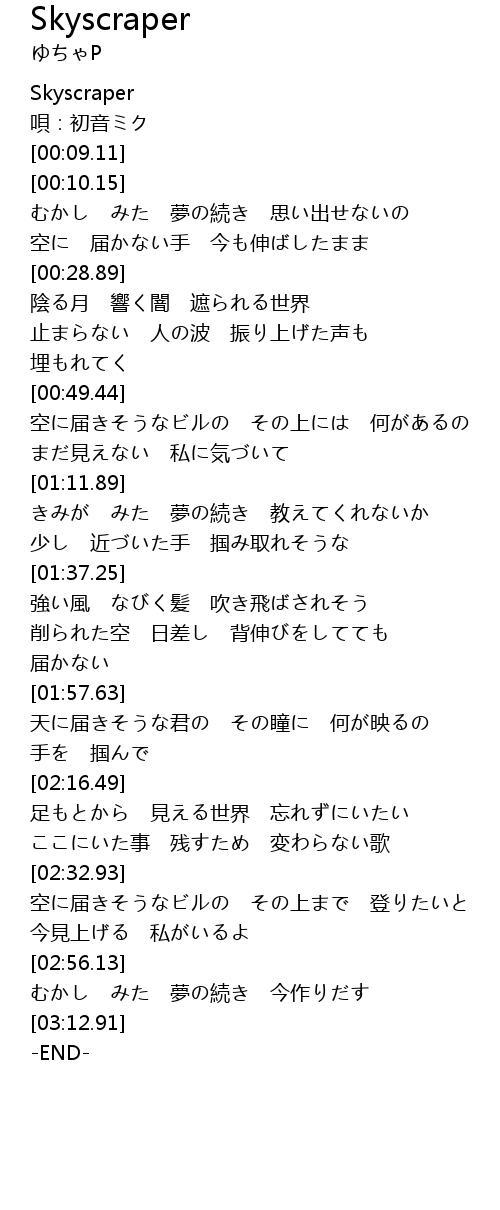 | [02:33.54] | 空に届きそうなビルの その上まで 登りたいと |