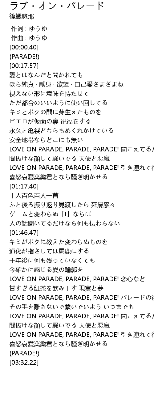 | [03:02.23] | LOVE ON PARADE, PARADE, PARADE! yǐn lián xíng |