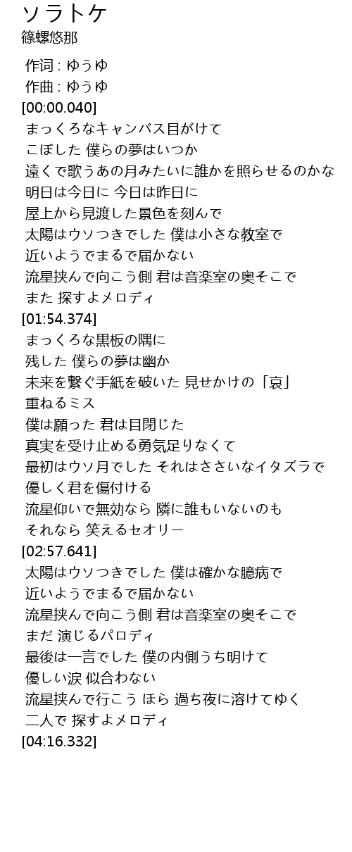 | [03:36.990] | 流星挟んで向こう側 君は音楽室の奥そこで |