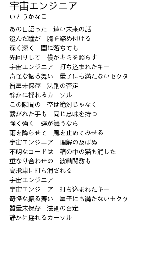 | [01:01.26] | 宇宙エンジニア 打ち込まれたキー |