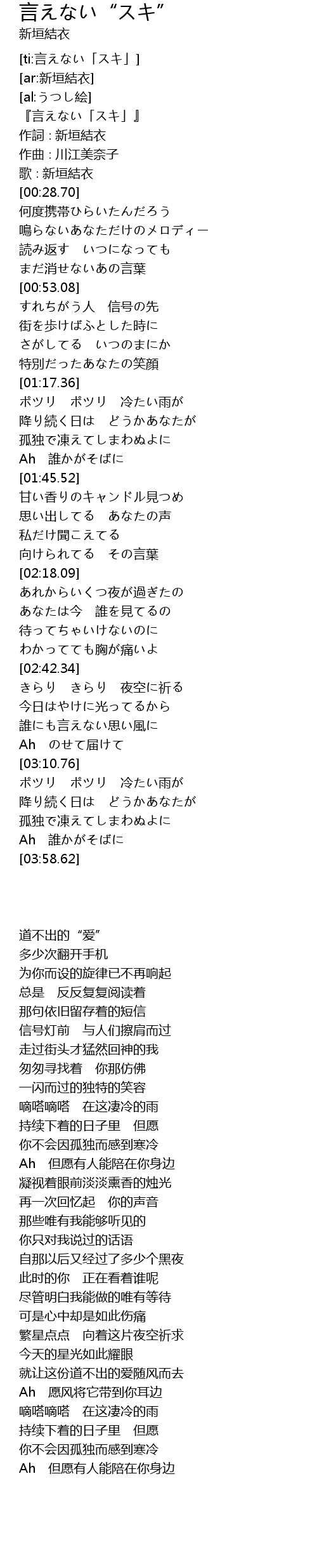 | [03:39.04] | 降り続く日は どうかあなたが |