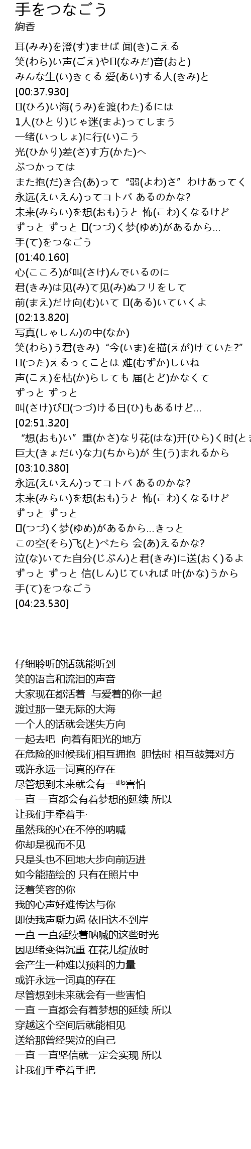 | [04:18.310] | 手(て)をつなごう |