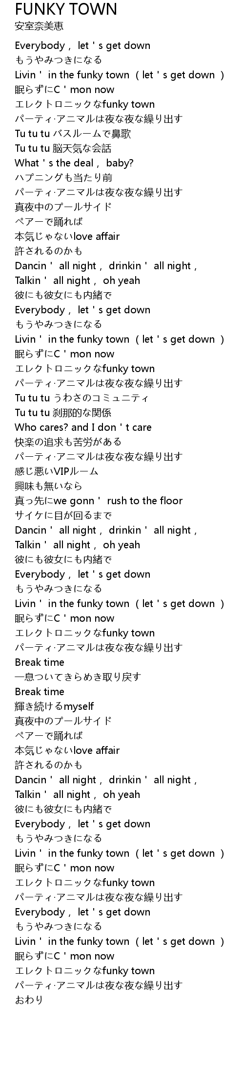 | [03:14.70] | Livin' in the funky town (let's get down ) |