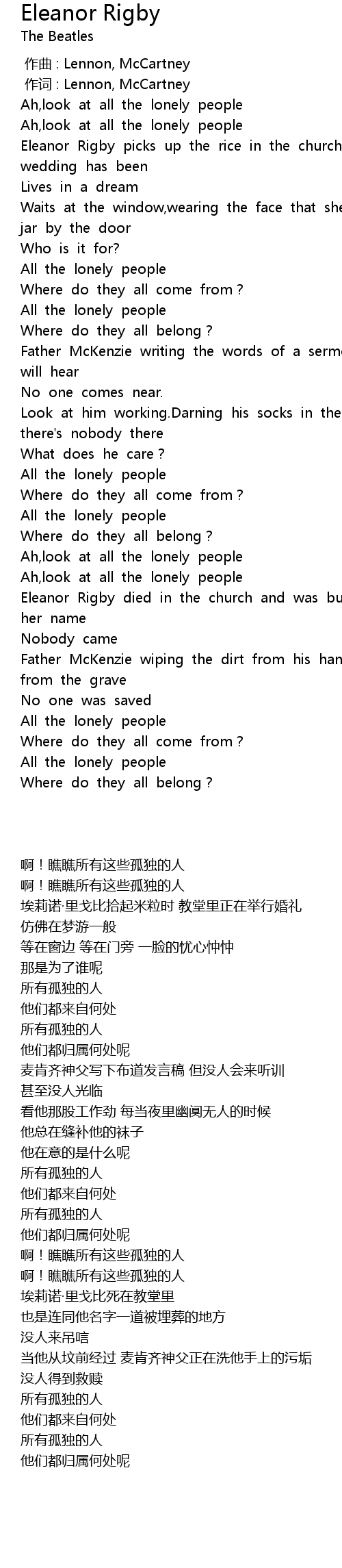 | [00:14.363] | 埃莉诺·里戈比拾起米粒时 教堂里正在举行婚礼 |