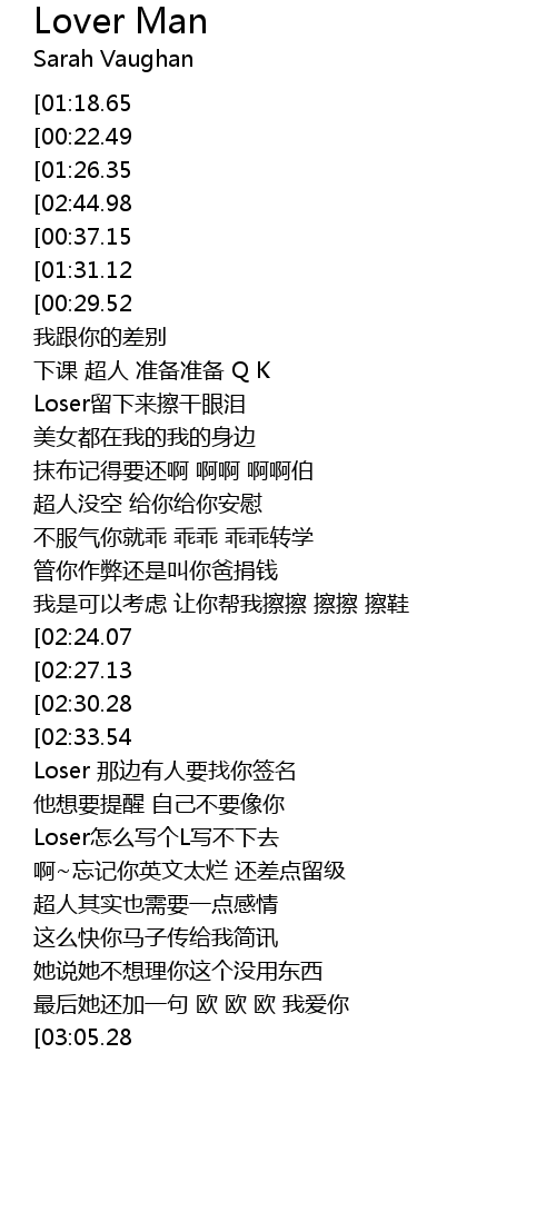 | [02:43.24][02:44.98][02:46.60][02:56.66][02:58.16][02:59.60] | year~我是superman |