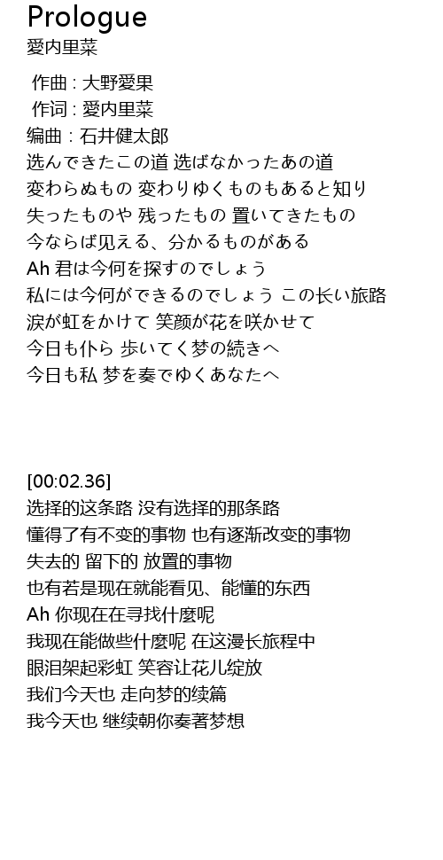 | [02:19.33] | 今日も仆ら 歩いてく梦の続きへ |