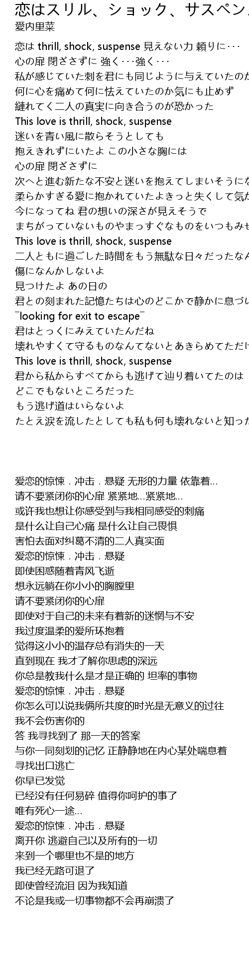 | [00:04.100] | 恋は thrill, shock, suspense 見えない力 頼りに・・・ |