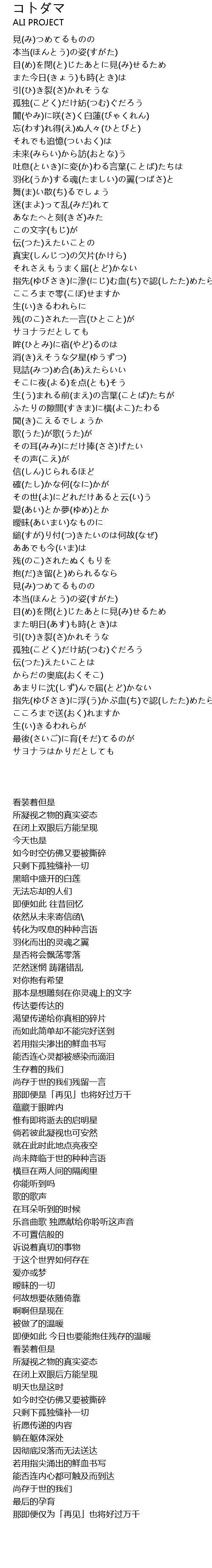 | [00:23.030] | 孤独(こどく)だけ紡(つむ)ぐだろう |