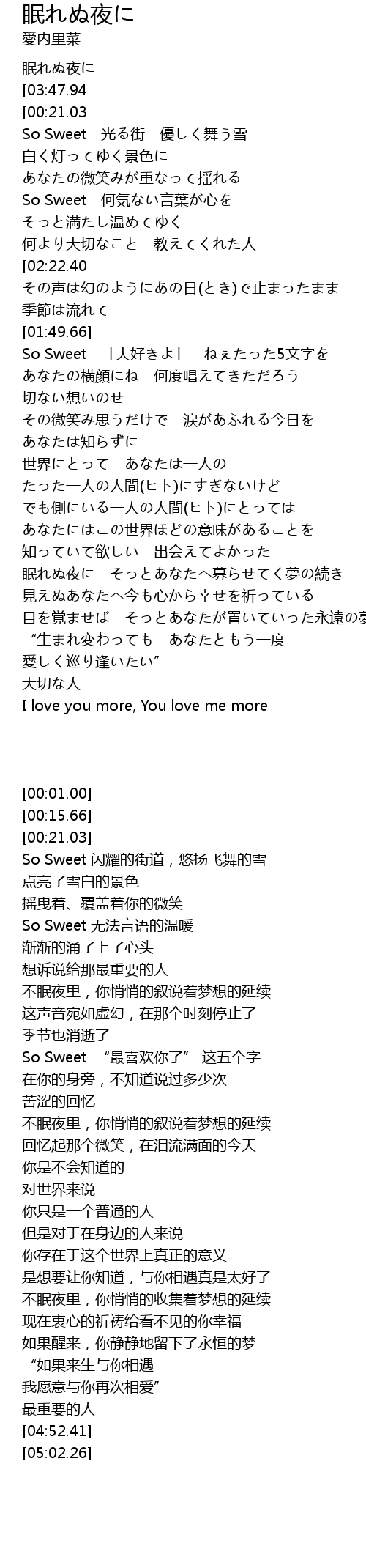 | [01:21.03][02:22.40] | 眠れぬ夜に そっとあなたが語りかける夢の続き |