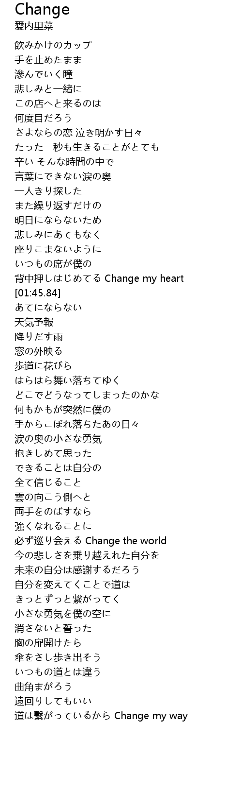 | [01:38.51] | 背中押しはじめてる Change my heart |