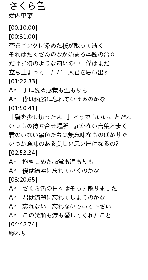 | [03:51.69] | Ah さくら色の日々はそっと散りました |
