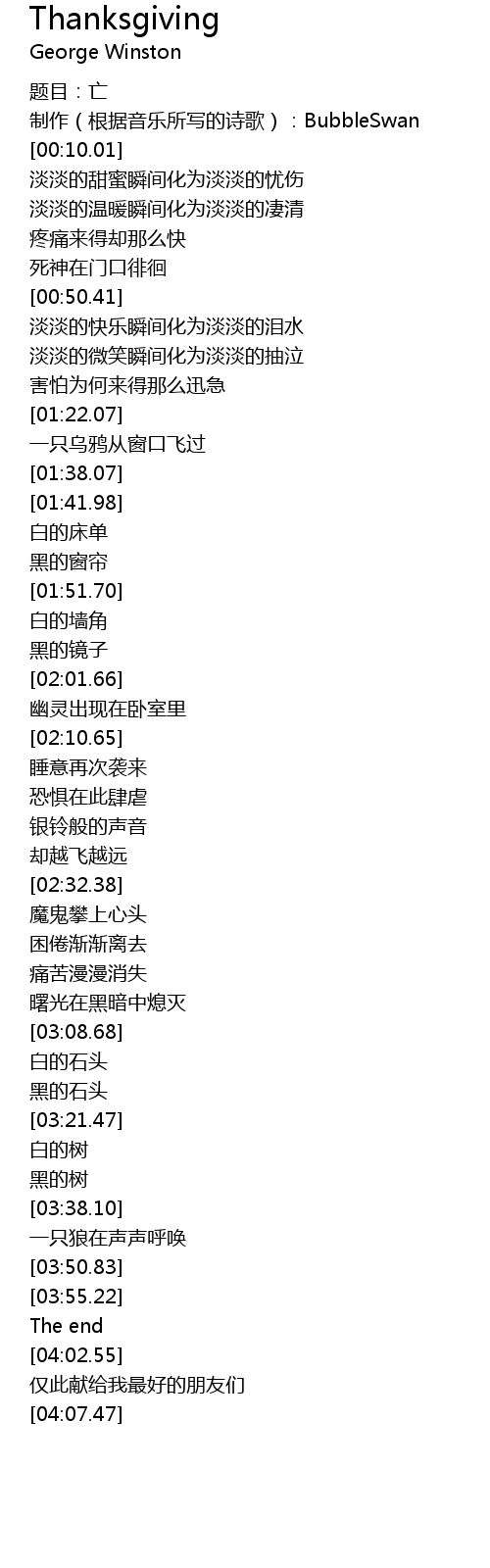 | [00:06.39] | 制作(根据音乐所写的诗歌):BubbleSwan |