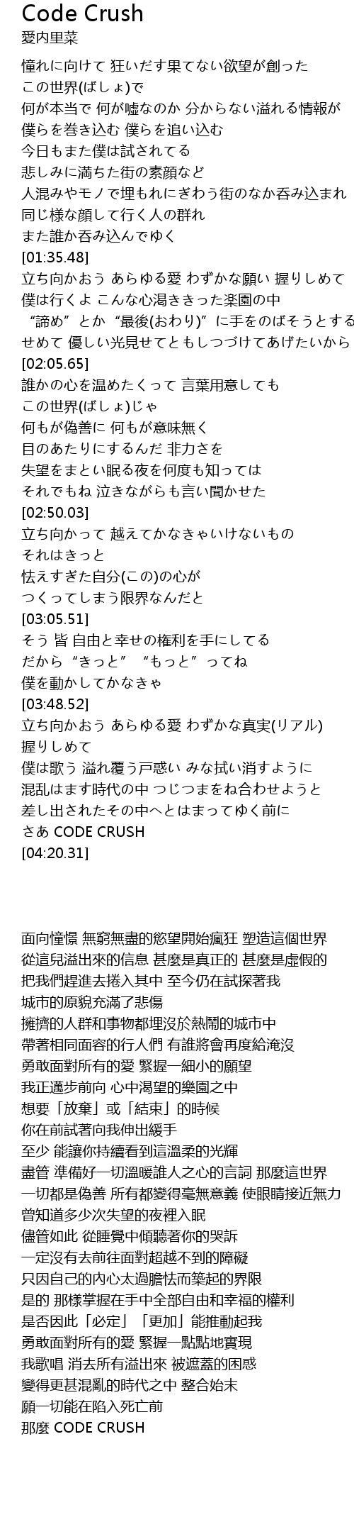 | [00:52.15] | 憧れに向けて 狂いだす果てない欲望が創った この世界(ばしょ)で |