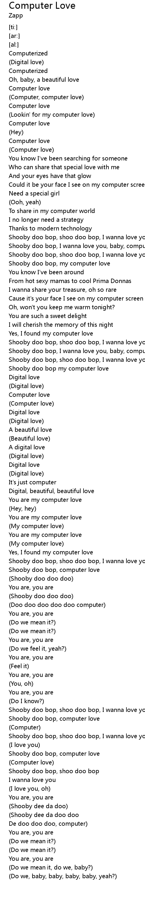 [01:37.16] Shooby doo bop, I wanna love you, baby, computer love