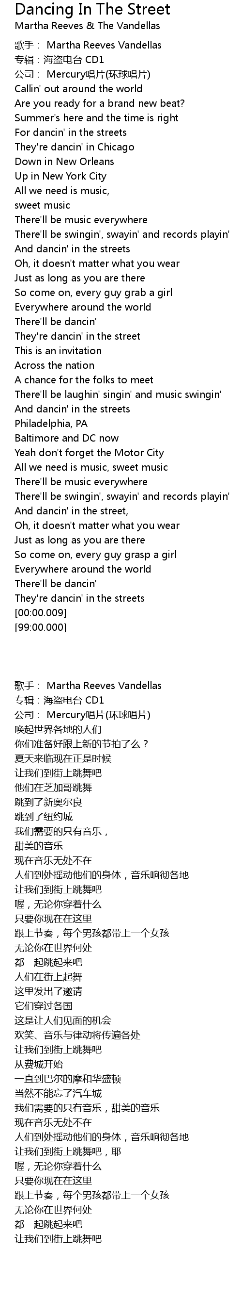 | [00:19.99] | For dancin' in the streets |