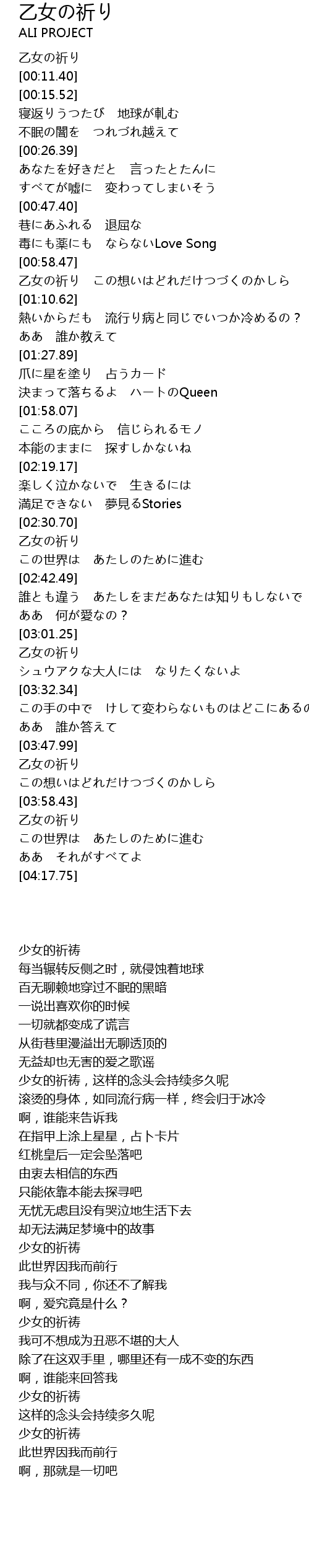 | [01:00.50] | 乙女の祈り この想いはどれだけつづくのかしら |