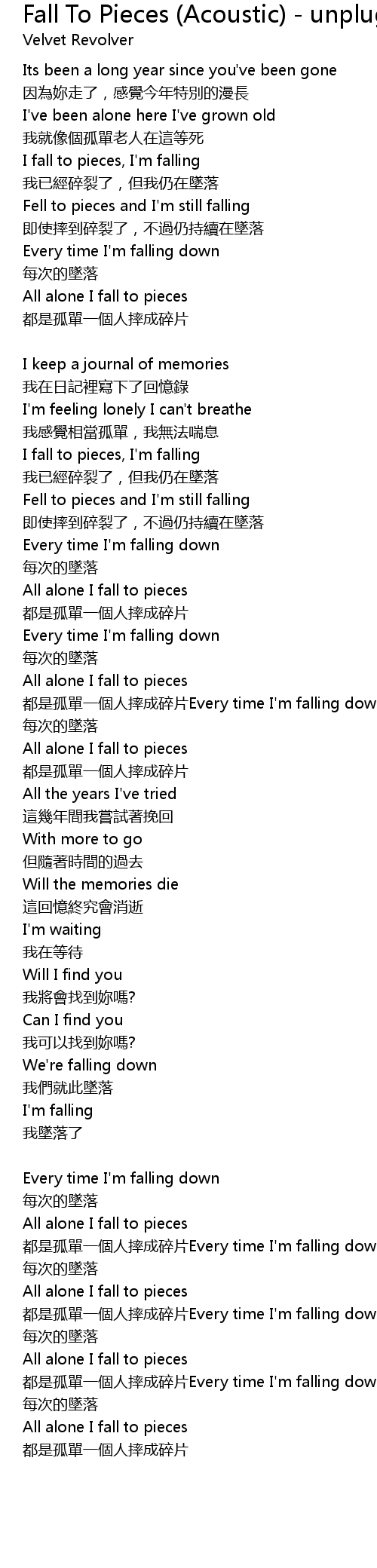 | 都是孤單一個人摔成碎片Every time I'm falling down | |