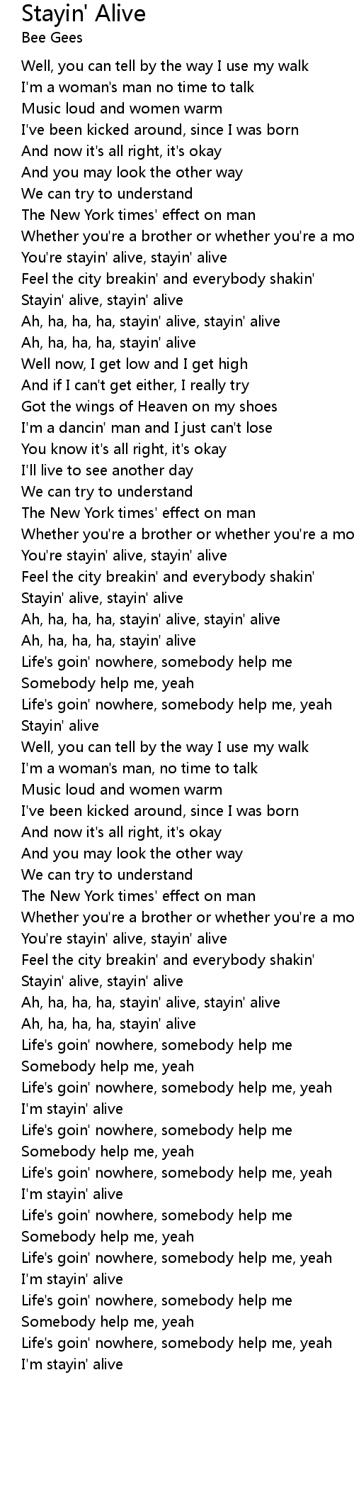 Ah, ha, ha, ha, stayin' alive, stayin' alive |
