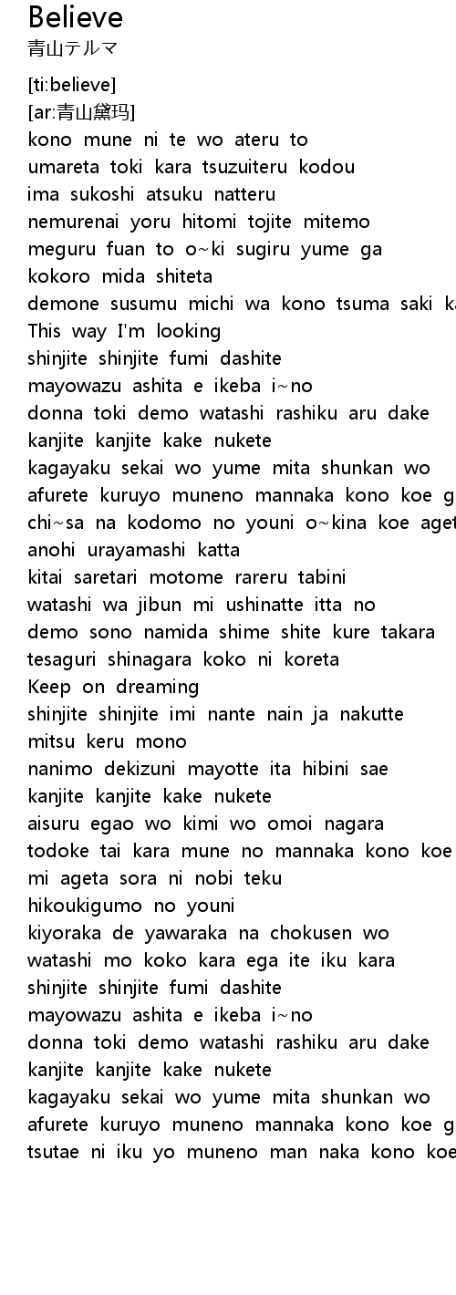 | [02:18.178] | shinjite shinjite imi nante nain ja nakutte |