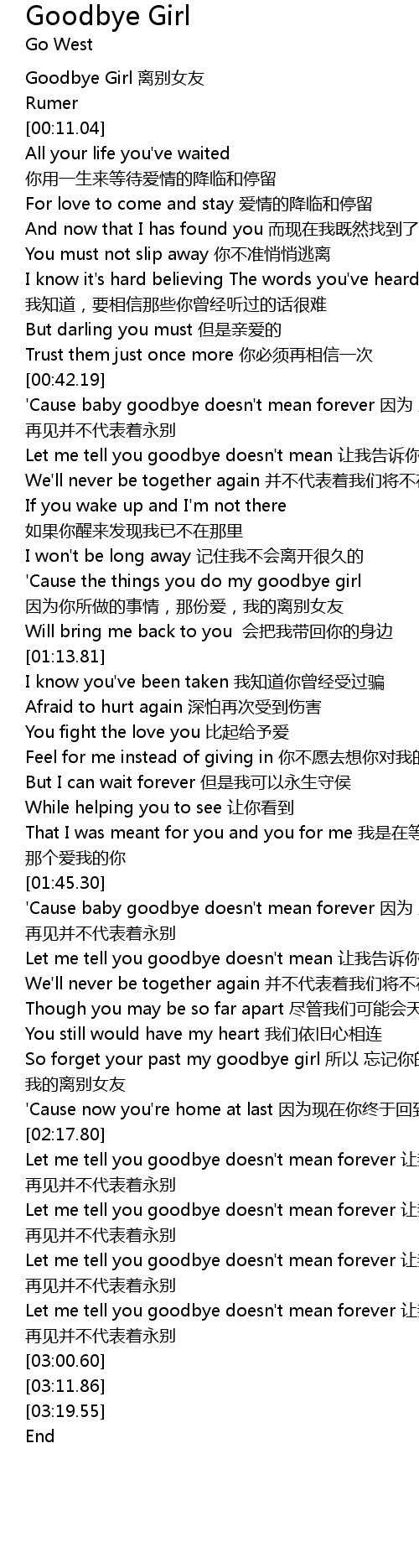 | [02:09.17] | So forget your past my goodbye girl suo yi wang ji ni de guo qu ba wo de li bie nv you |