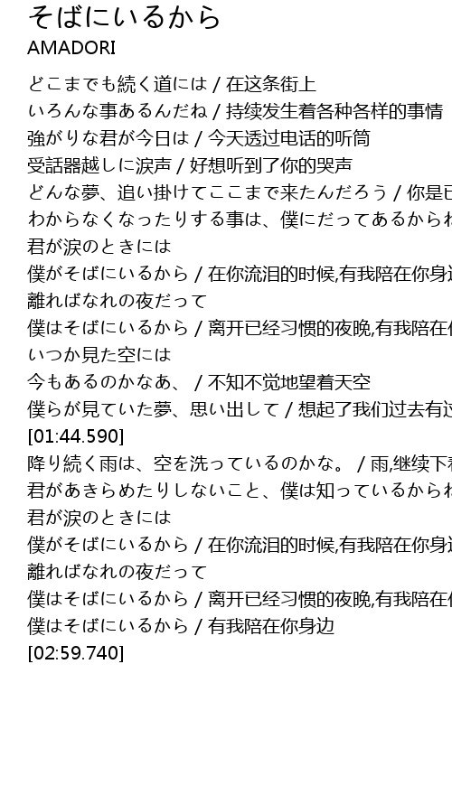 | [00:58.340] | 君が涙のときには 僕がそばにいるから/在你流泪的时候,有我陪在你身边 |