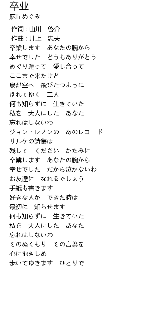 | [00:17.254] | 卒業します あなたの腕から |