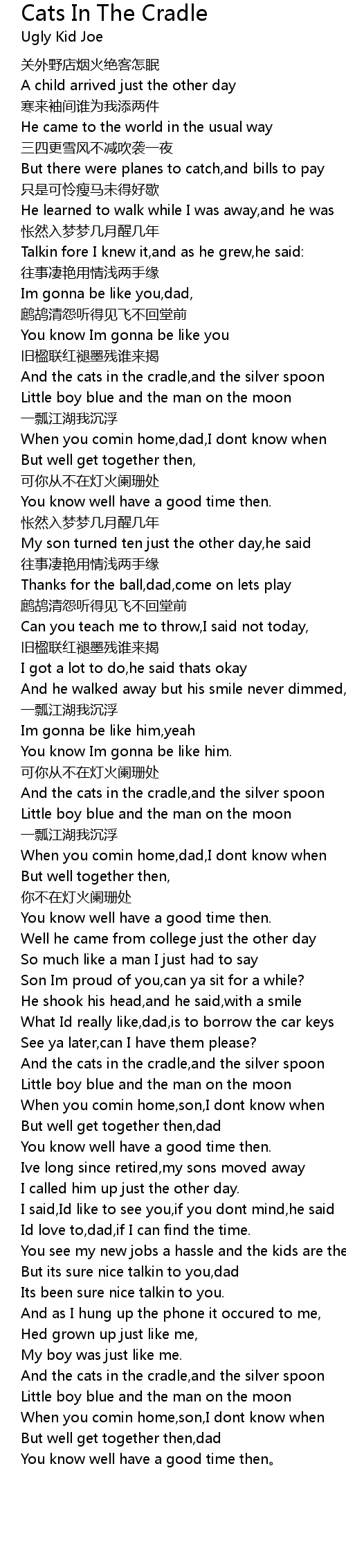 | [01:23.847] | And the cats in the cradle,and the silver spoon |