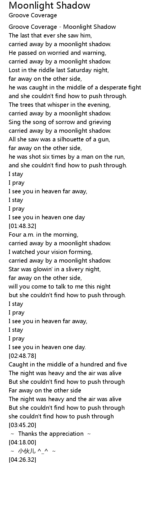 | [00:16.53] | Groove Coverage - Moonlight Shadow |