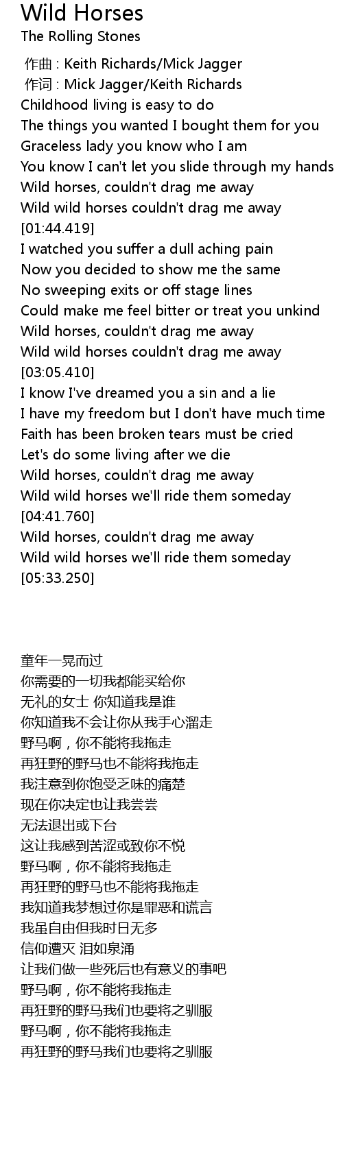 | [02:41.560] | Wild horses, couldn' t drag me away |