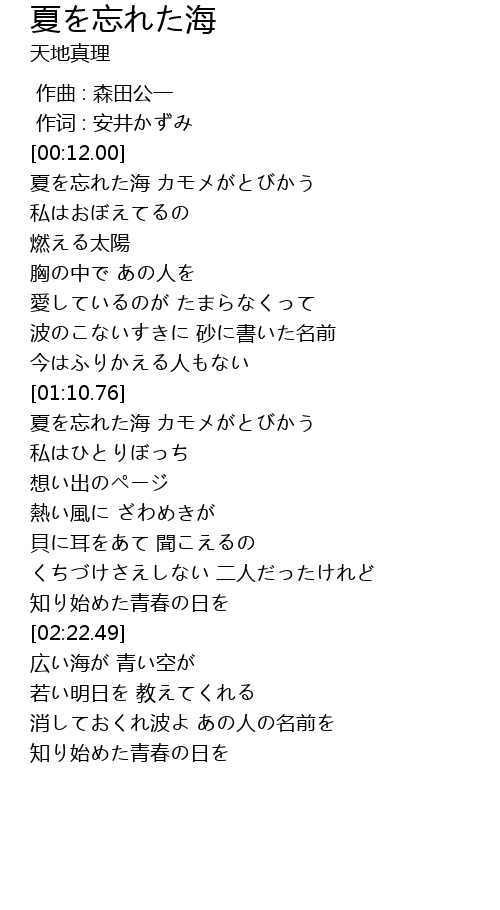 | [00:14.53] | 夏を忘れた海 カモメがとびかう |
