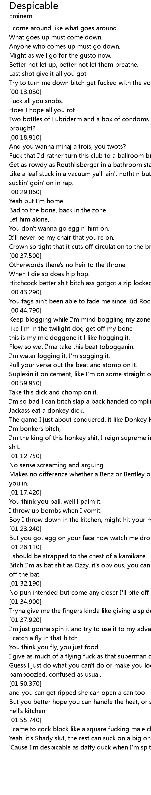 [02:02.130] 'Cause I'm despicable as daffy duck when I'm spitting.
