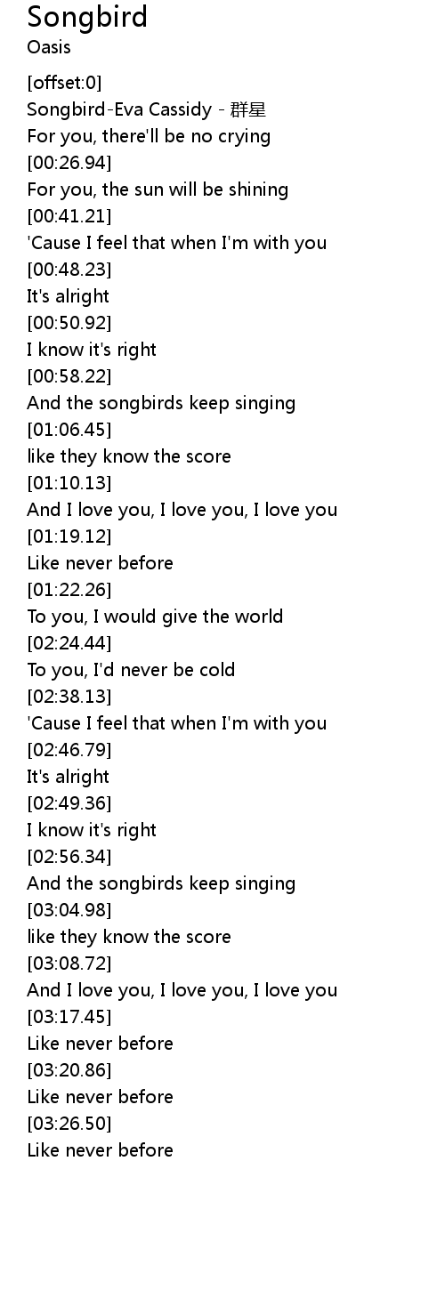 | [00:00.62] | Songbird-Eva Cassidy - 群星 |